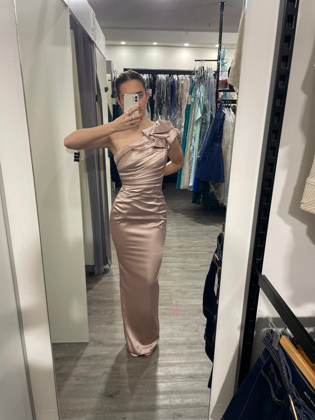 Introducing the NBM1015 from Nicoletta's New Collection. This stunning dress features a one-shoulder ruffled detail design and a flattering ruched fit, available in sizes 2-30. With a variety of custom color options, you'll find the perfect look for your special day. Elevate your bridal party with this elegant and exclusive dress.