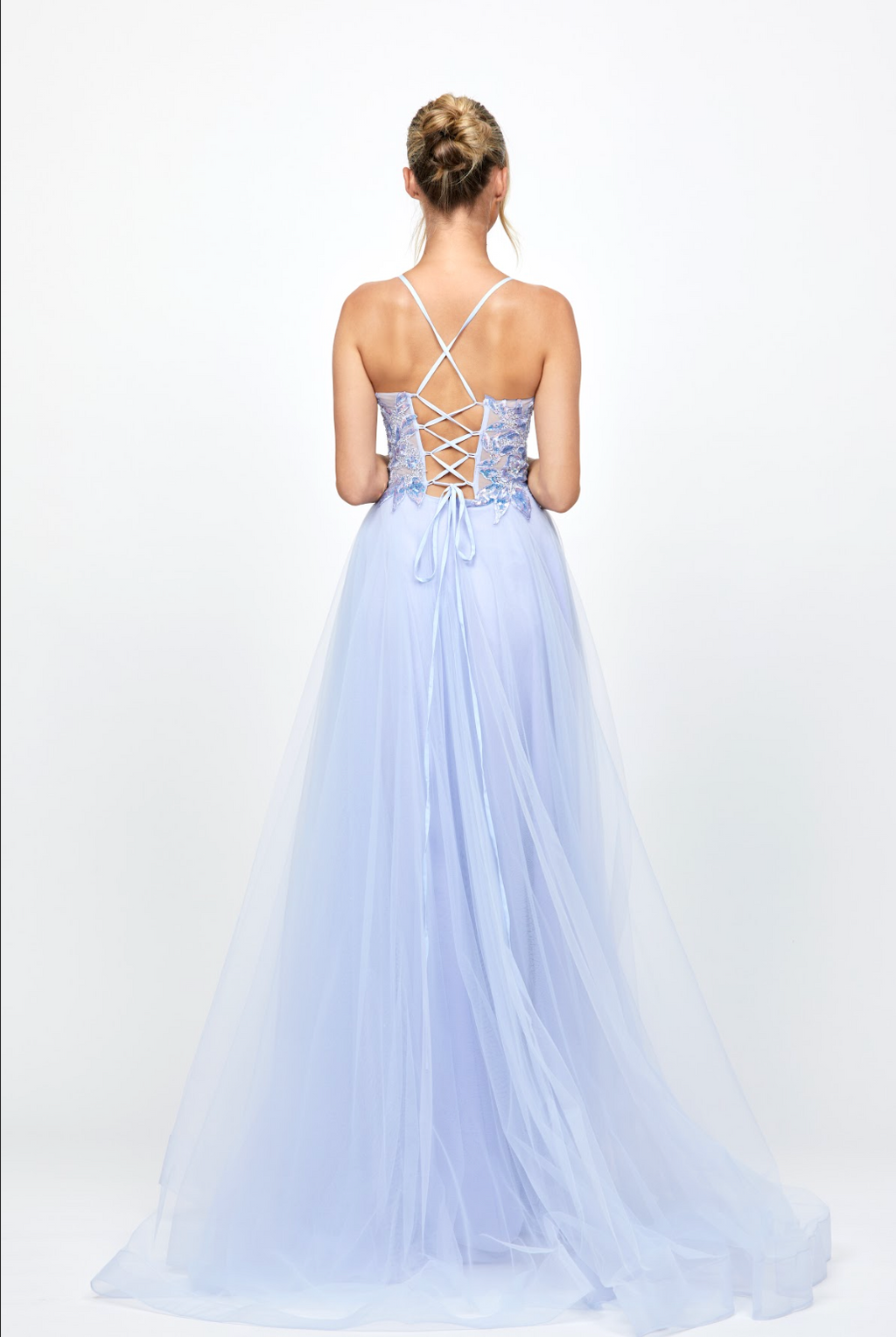 Elevate your style with this stunning tulle and lace dress, featuring a partially sheer bodice adorned with delicate lace appliqué and a modesty mesh insert for a hint of allure. The bodice is expertly structured with built-in bust cups and an eye-catching open strappy back that adds a modern twist. The flowing A-line skirt includes a crinoline hemline for added volume, a side slit for effortless movement, and a graceful back skirt detail. Fully lined with an invisible back zip closure, this dress perfectly balances romantic elegance and contemporary design—ideal for weddings, formal events, or special occasions.