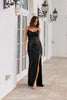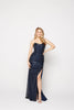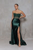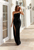 Softly draped sequin fabric that hugs those gorgeous curves Strapless bodice with a curved neckline Fitted silhouette High leg split...