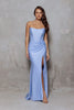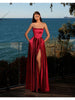 Super soft strapless gown with a straight neckline, boned bodice, and high leg. Comes with detachable spaghetti straps.