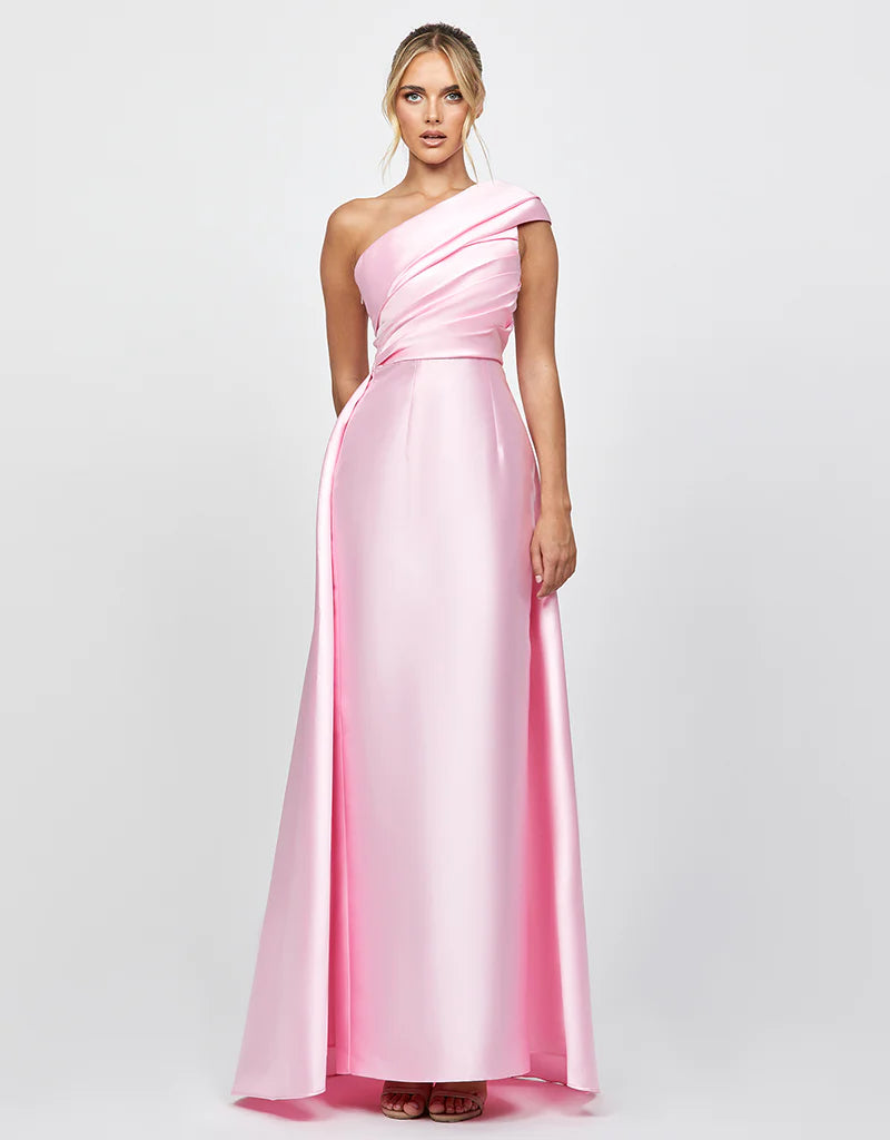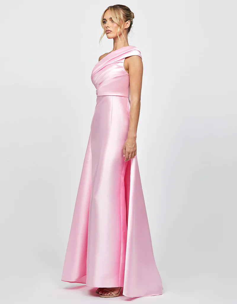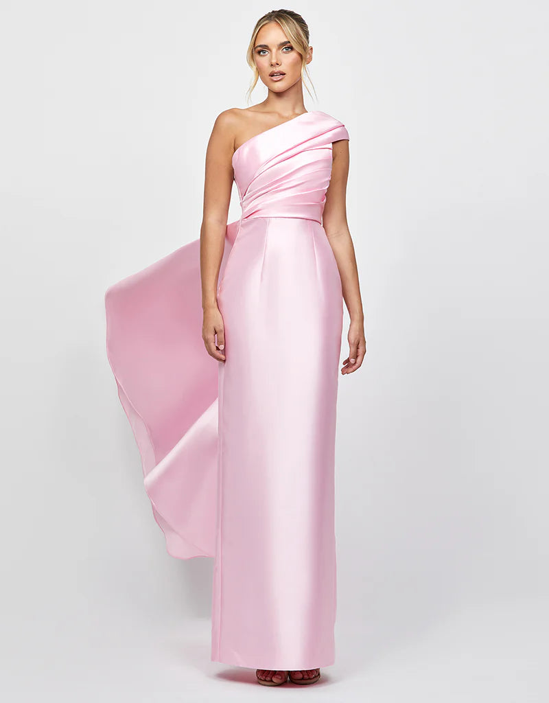 Make an entrance in this graceful and refined one-shoulder gown, crafted from luxe duchess satin. Designed with an asymmetric neckline featuring an elegant folded detail, this style exudes sophistication. The bodice is expertly tucked and structured with internal boning and built-in cups for a flattering and supportive fit. A full-length column skirt falls effortlessly to the floor, elevated by a dramatic back split and a flowing train overlay that trails behind you with every step. Fully lined and finished with an invisible side zip, this gown is perfect for formal events, weddings, and black-tie occasions.